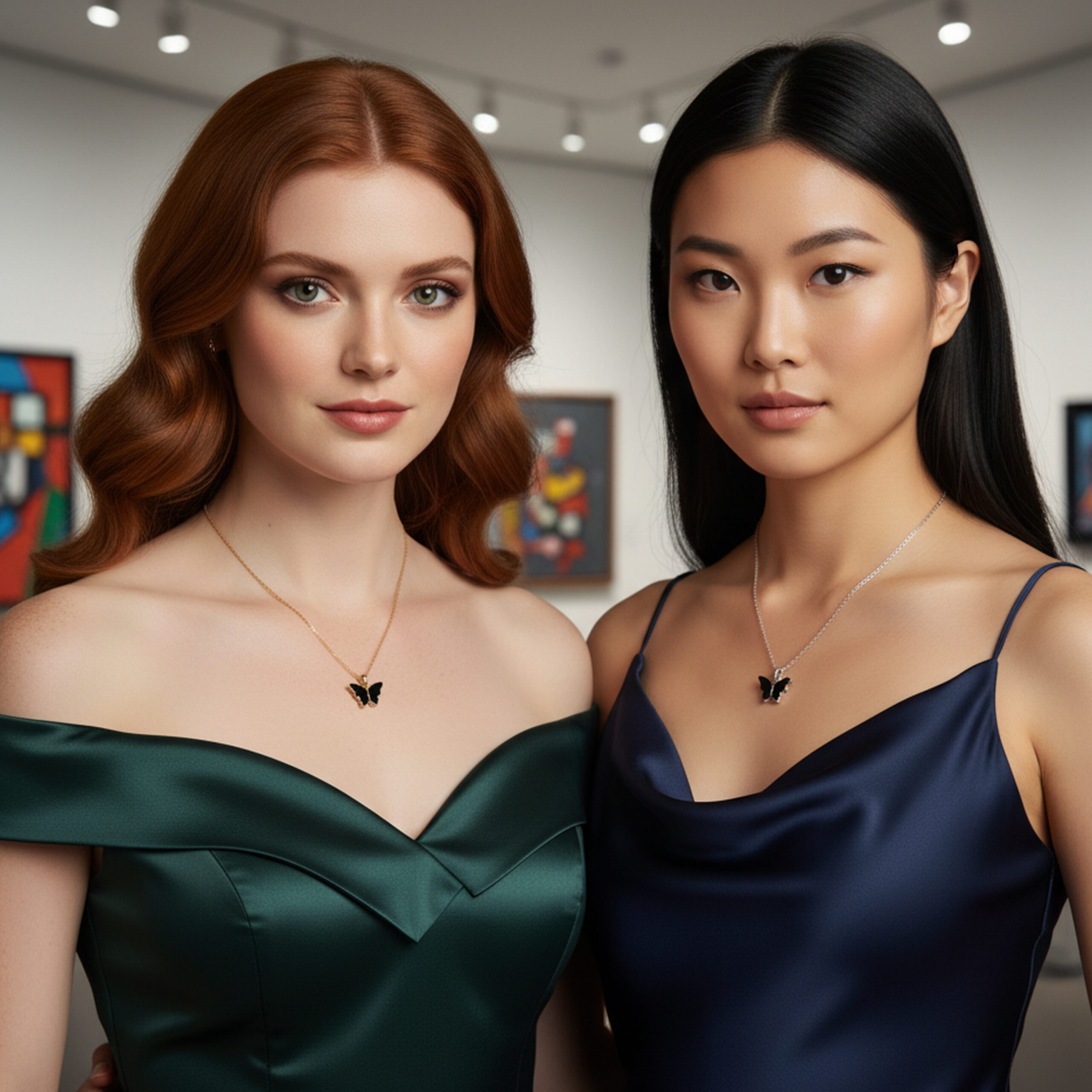 Upgrade your style with this combo of 2 Black Butterfly Pendant Nack Chains, featuring both Gold-Plated and Silver-Plated chains. These stylish nack chains come with elegant black butterfly pendants that add a cute and aesthetic touch to every outfit. Comfortable, lightweight and skin-friendly — perfect for daily wear, college fashion, Western outfits, parties, photoshoots and gifting.