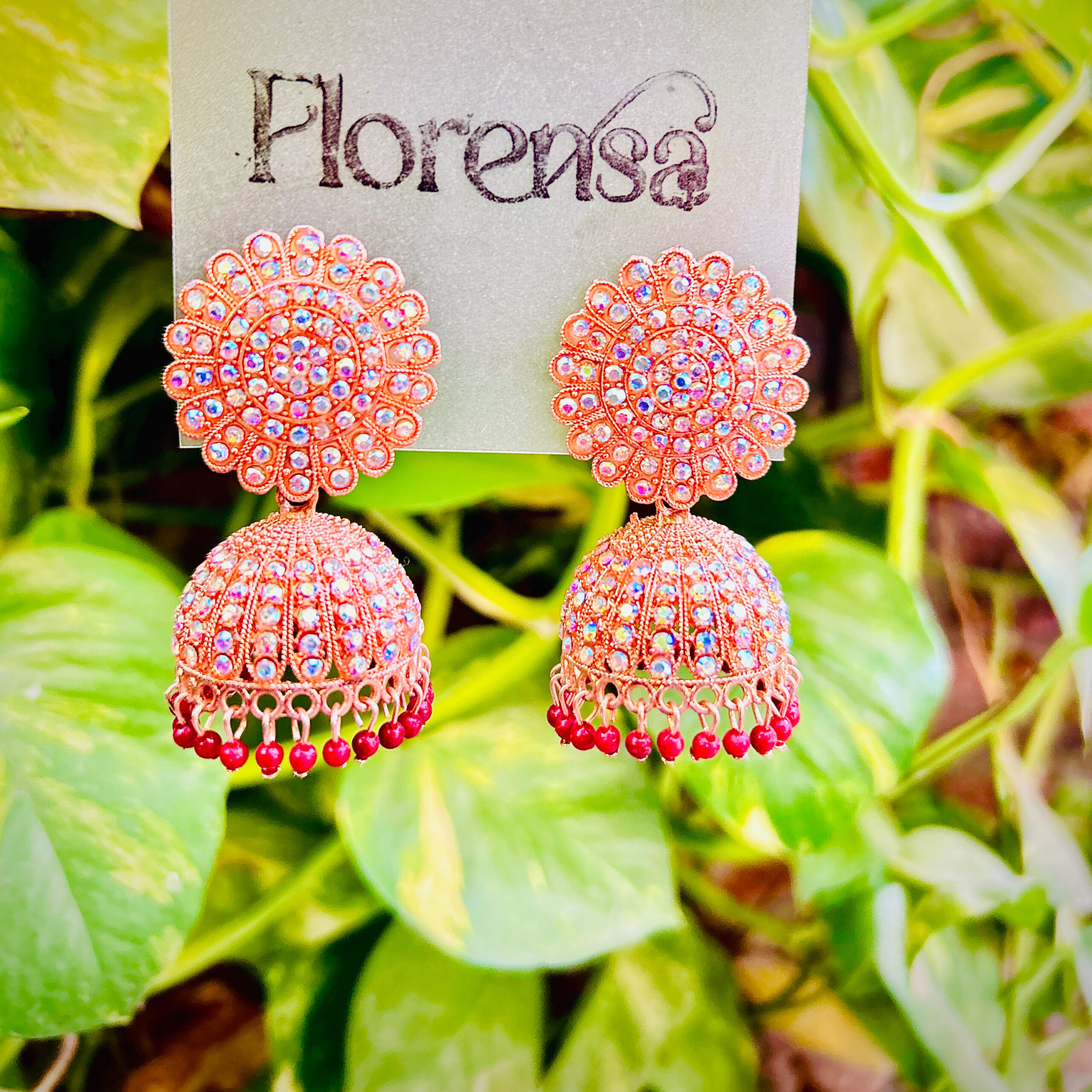 Add a royal sparkle to your look with the Florensa Blush Bloom Maroon Bead Jhumka.