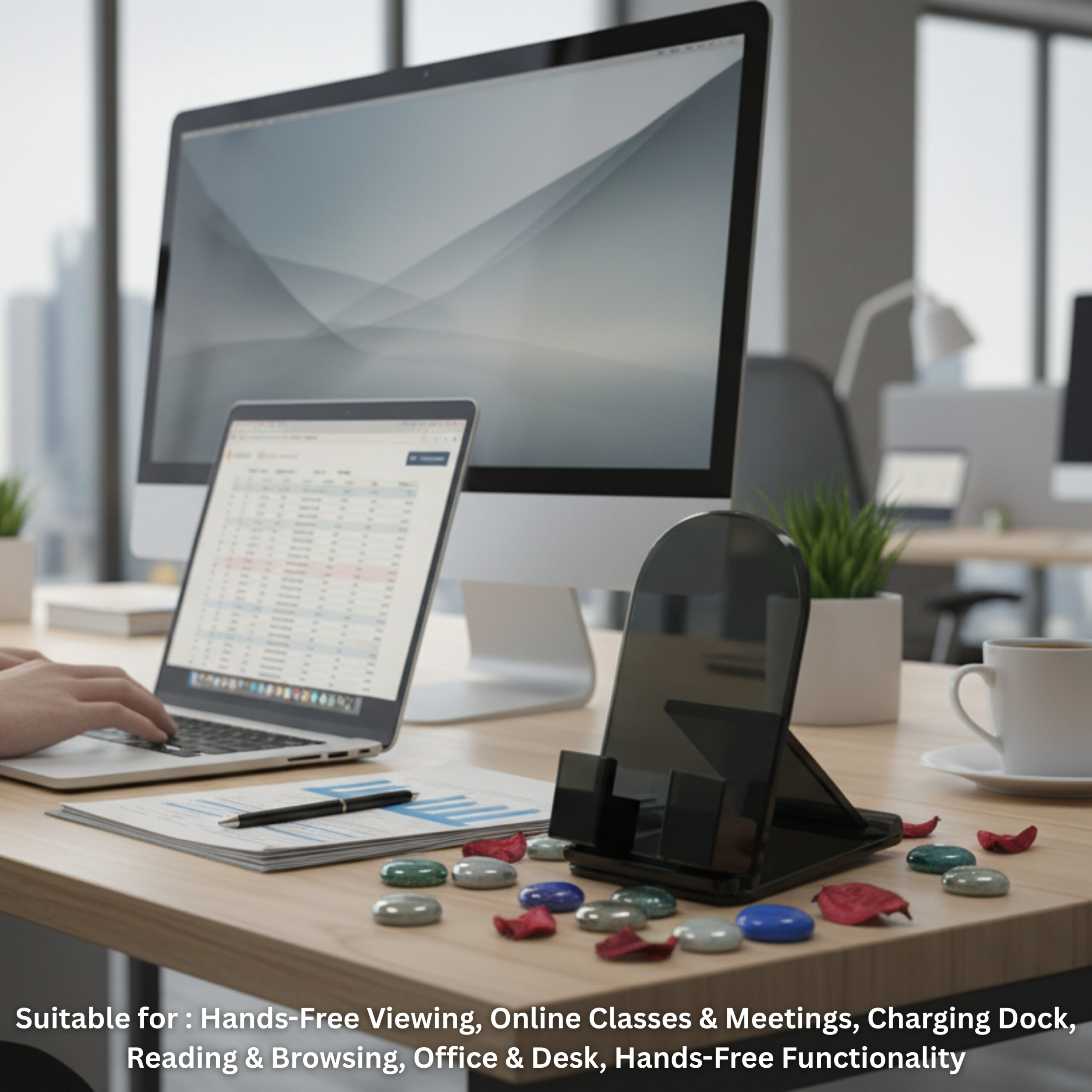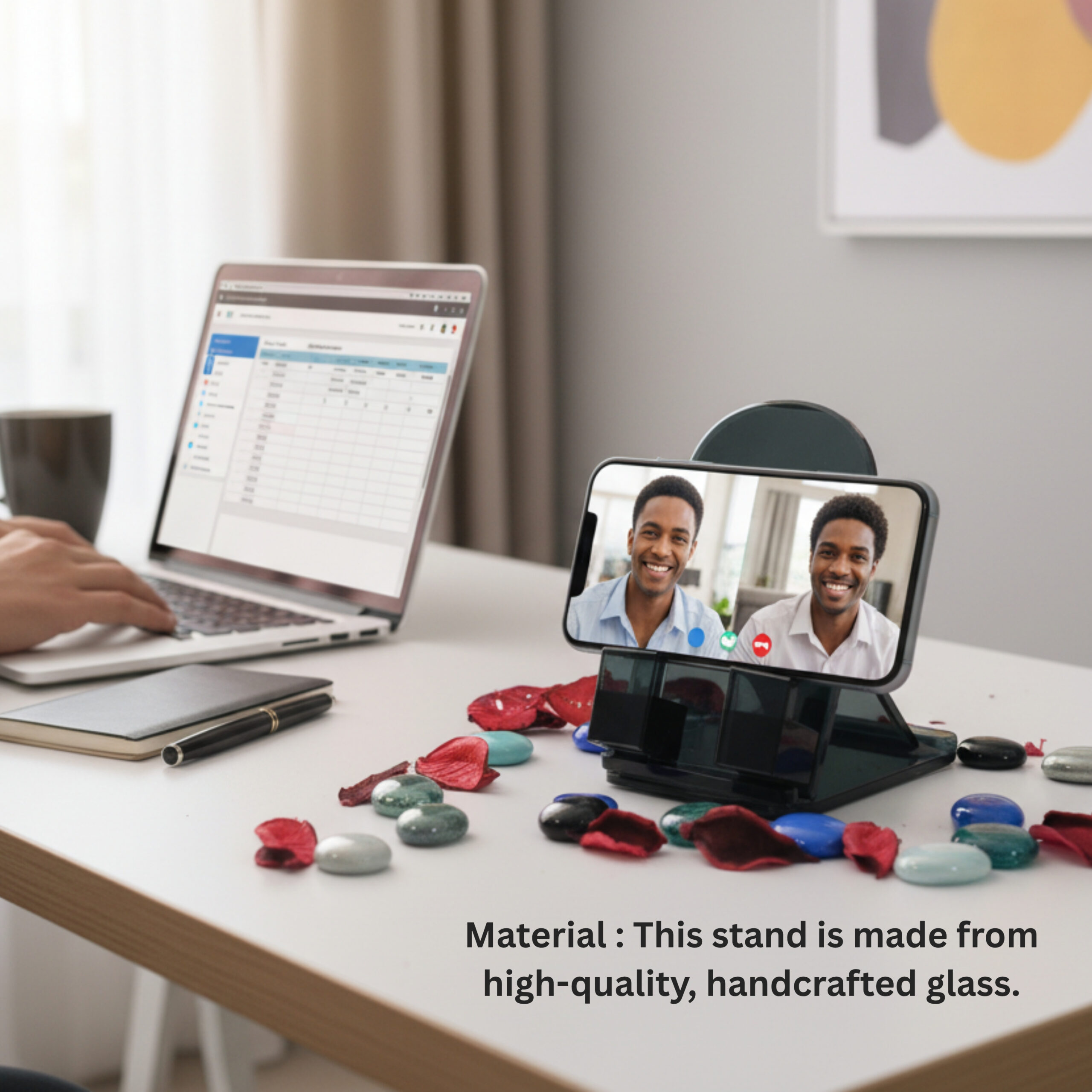 Organize your workspace with style using the Florensa Handcrafted Artisan Glass Mobile Phone Stand, made from high-quality handcrafted glass. Perfect for hands-free viewing, online classes, virtual meetings, reading, browsing, or charging your device, this elegant stand adds both functionality and aesthetic appeal to your office desk, study table, or bedside. A practical and stylish accessory for everyday use.